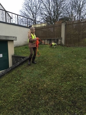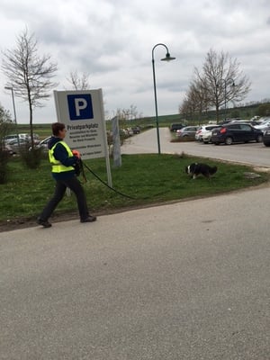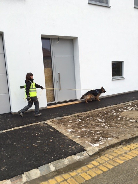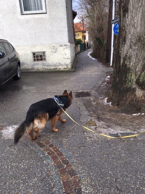 Kurz vor dem Ziel eine Garage, wo Xenia schnurstracks abbiegt. Kein Wunder, denn in die abschüssige Garage hat ´s ganz schöne Hautschuppen runtergeweht. Nachdem die Garage bis aufs letzte inspiziert wurde, hat sich Xenia entschlossen, doch auf der Strasse weiter zu suchen... Und Bingo ... 400 Meter weiter dann der erlösende Geruchspool vom Herrchen aus dem Auto - mitten auf einer stark frequentierten Straße.