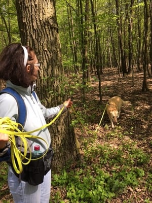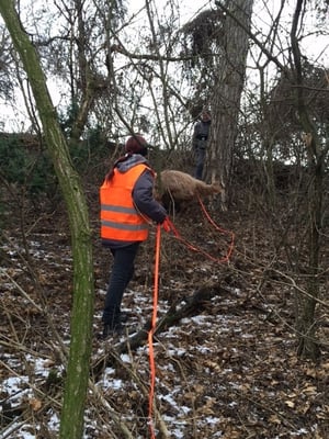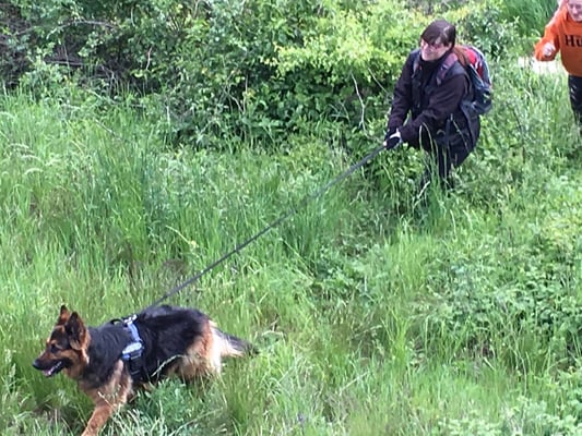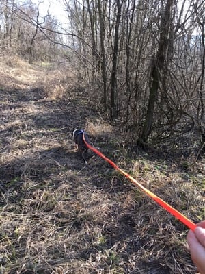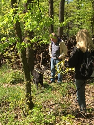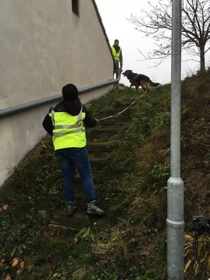 1. Trail: Zu suchender Hund läuft direkt in gerader Linie (an der Leine) und wird in einer Schlucht gefunden.