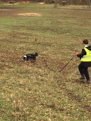 2. Trail: Zu suchender Hund läuft ohne Leine also kreuz und quer, ebenso ein zweiter Hund (an der Leine zur Ablenkung) und beide Hunde werden gefunden, wobei der zu suchende Hund näher ist, der zweite Hund ist versteckt mit der Begleitpeson.